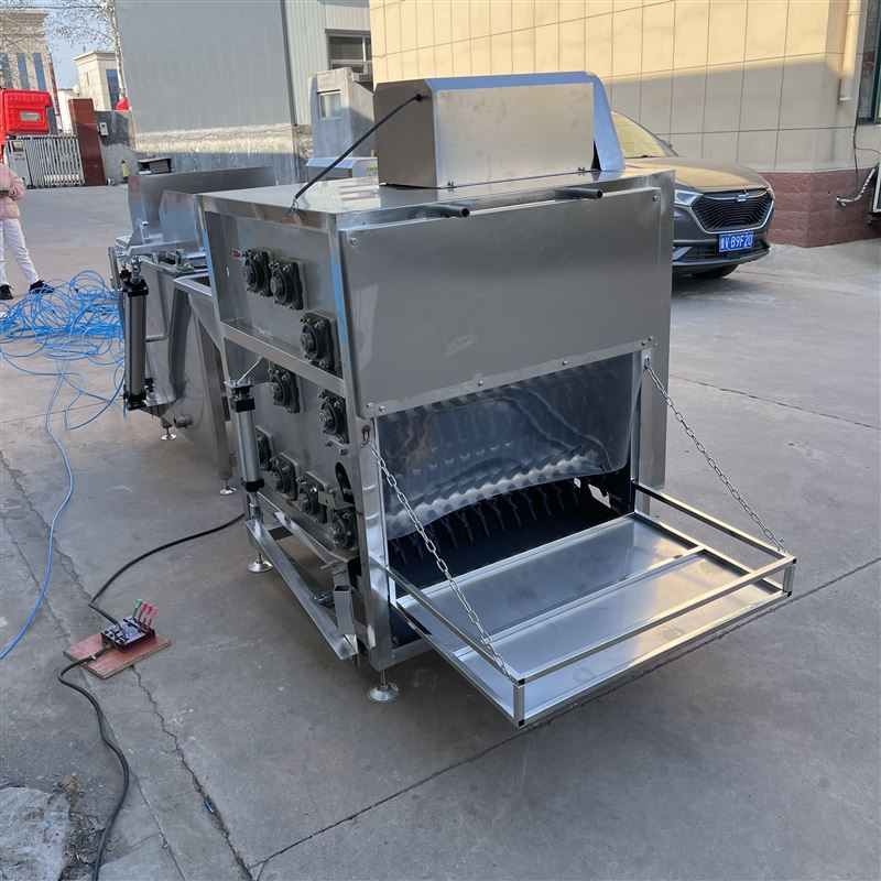 全自动鸭鹅脱毛机 家禽打毛机是由两台中小型的家禽屠宰设备组合套装而成,其中一台小型的七轴家禽鸡鸭鹅打毛机设备,还有一台小型的自动翻转,自动搅拌,带自动控温的中小型的鸡鸭鹅烫毛机设备,我们厂家的技术人员将两台中小型的家禽屠宰设备,通过自动化装置,让两台设备都能达到自动化程度,而且使用此套设备比较节省人工,使用此套设备一次可以节省人工3-5个人左右。我们厂家所生产销售的此套设备的应用市场比较广泛,此套设备即可以用来针对于鸭子烫毛脱毛使用,还可以用来针对于鹅烫毛打毛使用,也可以用来针对于鸡进行烫毛脱毛使用,而且使用此套设备还能很好的保护白条家禽的皮相。